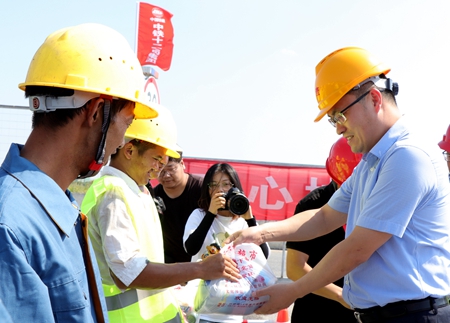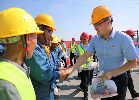 洪湖鵬一行來到市區(qū)快速路環(huán)線工程(一期)土建2標段施工現場,與建設工人一一握手,送上防暑慰問用品,感謝大家為快速路建設和嘉興城市建設所做的貢獻,并囑咐大家在高溫天氣要注意防暑降溫,保重身體。